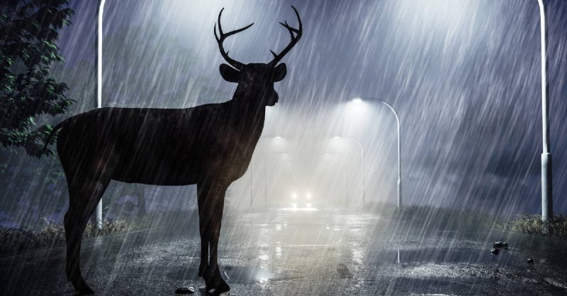 Hirsch auf der Straße bei schlechter Sicht ©AdobeStock